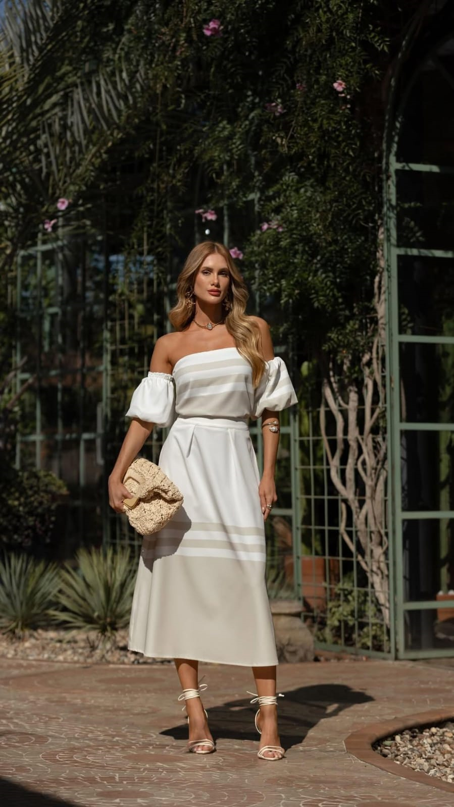 Esta peça exala elegância com seu design de decote reto que valoriza o colo, realçado pela tendência das mangas bufantes/com volume (ou puff sleeves) que adicionam um toque romântico e moderno.