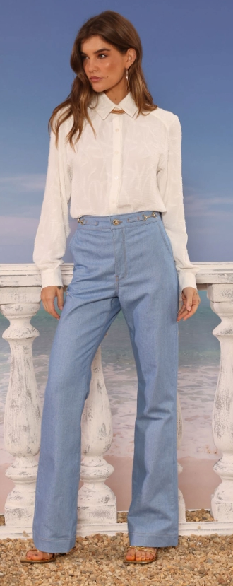 Calça Boot Cut com detalhe lateral que une elegância e modernidade, sua modelagem ajusta-se na cintura e alonga a silhueta.