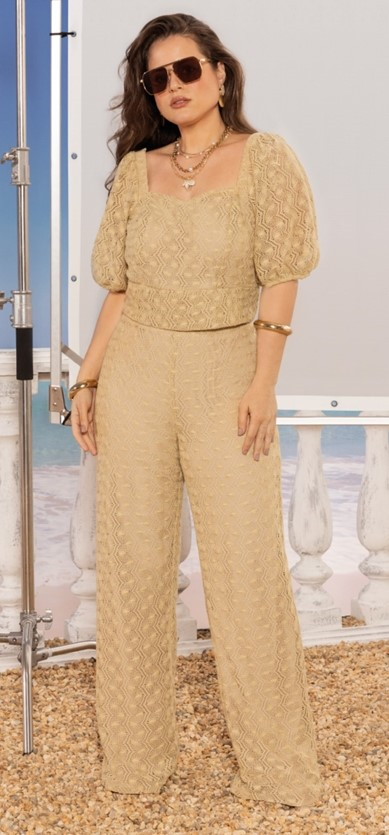 Calça Pantalona em Crochet Texturizado - Bege Areia (Plus)