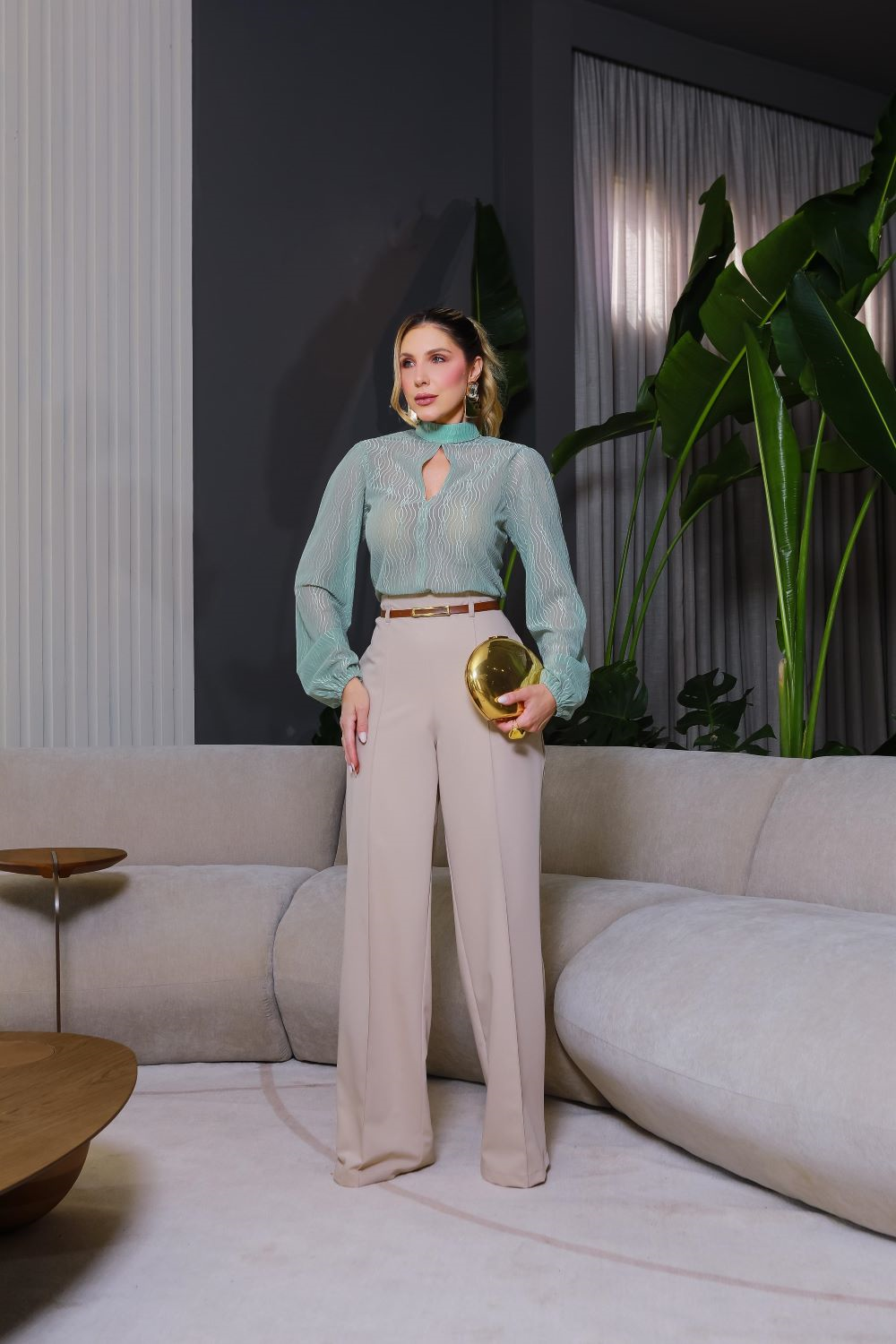 Calça confeccionada em tecido encorpado, com shape reto e caimento elegante. Possui cós alto com passantes aplicados, bolsos modelo faca, fechamento lateral por zíper e forro interno.