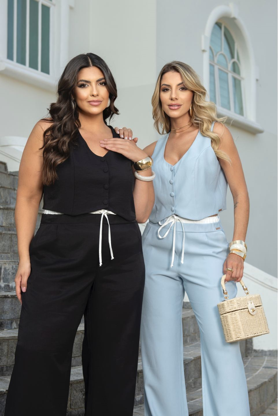Este colete cropped é a peça chave para um visual moderno e sofisticado. Confeccionado em um tecido leve com textura sutil, ele apresenta um decote V clássico e fechamento frontal por delicados botões.