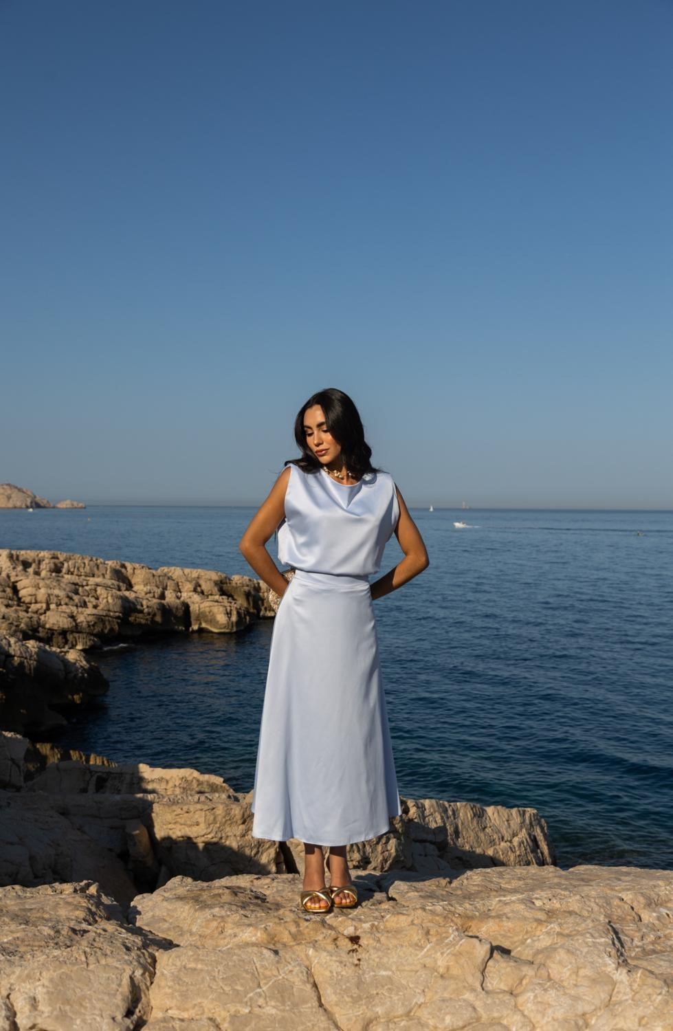 Conjunto confeccionado em tecido Heavy Milk, com caimento sofisticado e leve brilho acetinado. A blusa possui forro, ombreira e fechamento posterior por botão, que forma uma sutil abertura em gota.