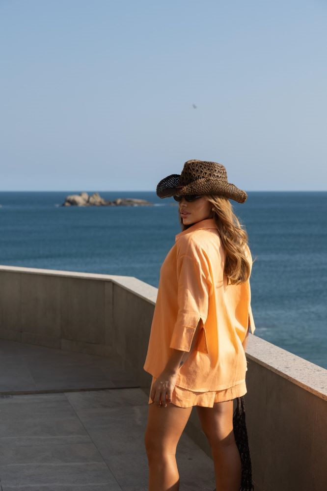 Conjunto confeccionado no tecido Cambraia, leve e confortável. A camisa possui modelagem ampla, mangas 7/8 com punho largo, gola tradicional e fechamento frontal por botões.