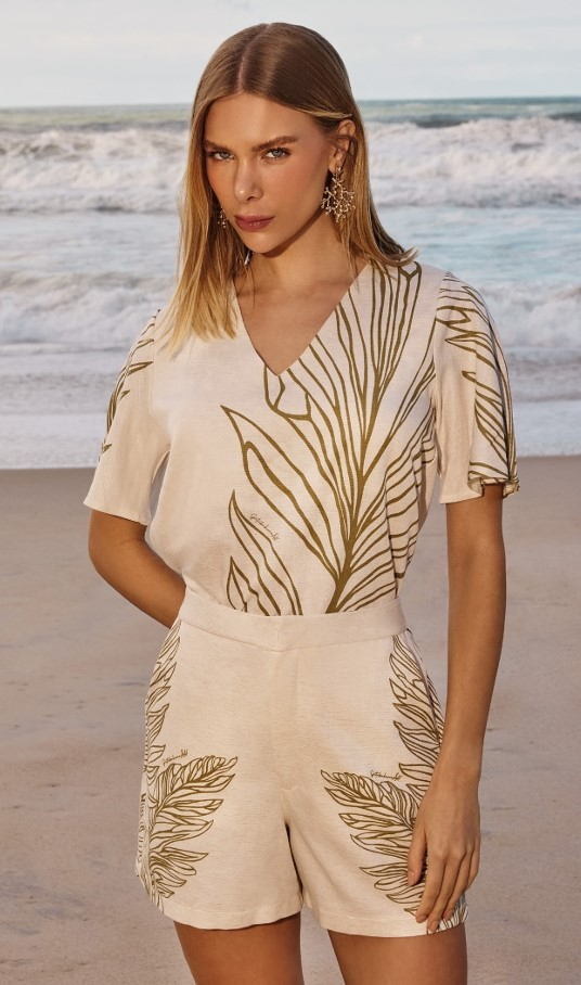 Localizada Leve a sofisticação da natureza para o seu closet com este shorts em alfaiataria leve. Na cor off-white, a peça ganha vida com uma estampa de folhagem em tons de oliva, estrategicamente posicionada na lateral para criar um visual orgânico e moderno.