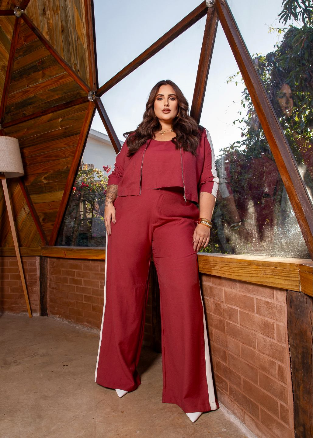 A calça reta conta com fechamento por zíper e botão, bolsos faca funcionais, elástico no cós para melhor ajuste ao corpo e listras laterais que alongam a silhueta. Para completar o look, o top de alça com reguladores garante sustentação e versatilidade, podendo ser usado por baixo da jaqueta ou em composições separadas, o conjunto ainda acompanha uma faixa, ideal para marcar a cintura ou ser usada como acessório complementar.