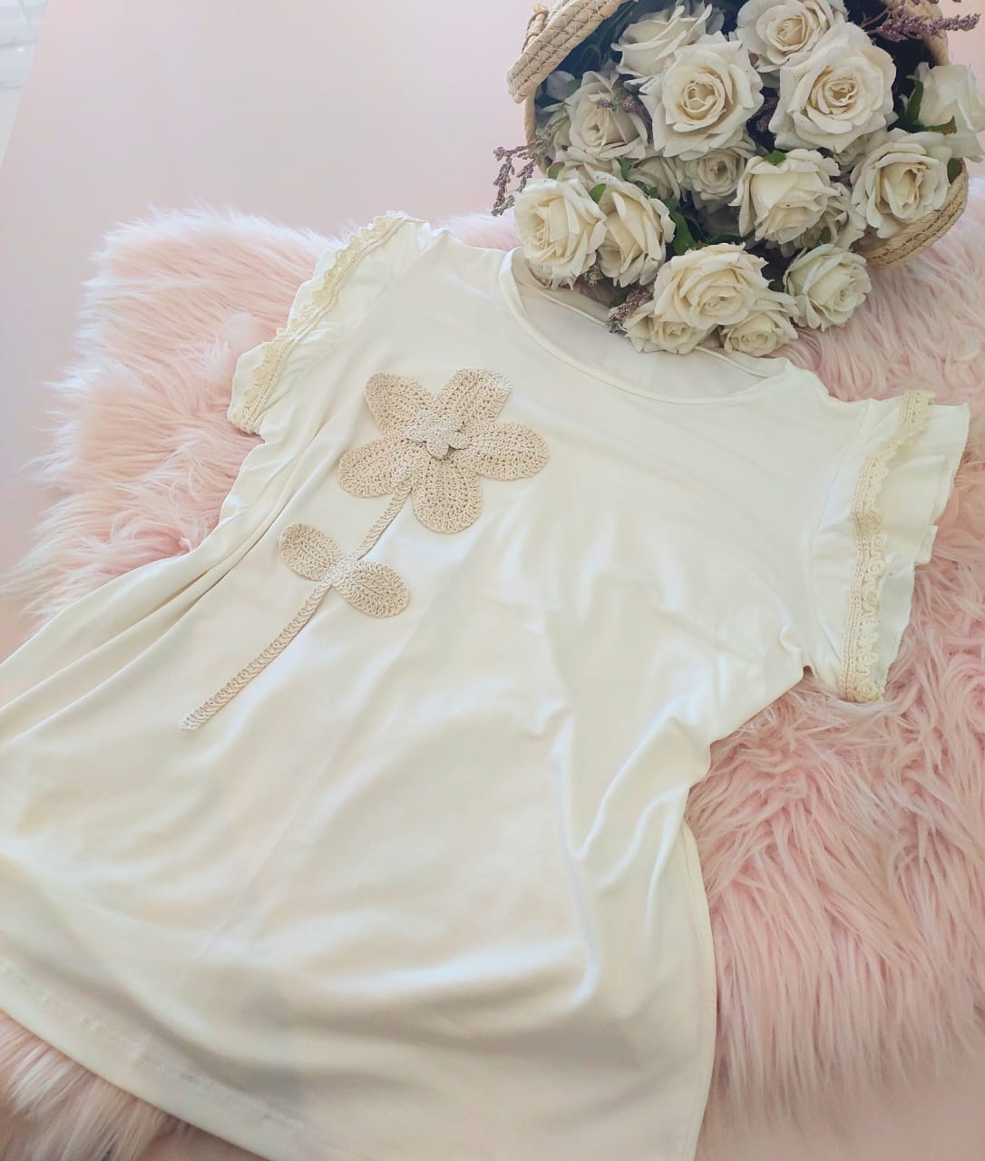 O destaque fica pela aplicação manual de uma flor em crochê as mangas delicadamente texturizadas dão charme a essa peça fresca e delicada.
