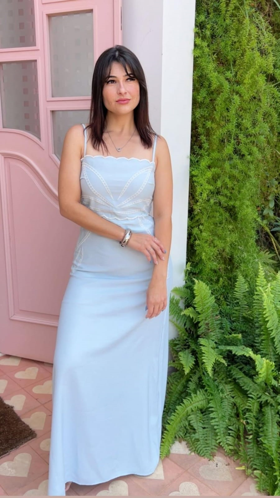 Este deslumbrante vestido longo na cor azul-claro (tom Serenity ou Azul Bebê) exibe um caimento fluido e elegante. O destaque fica por conta do decote com alças finas e do detalhe trabalhado em formato de ondinhas (scallop) e bordados delicados em tom branco na parte superior do busto e cintura.