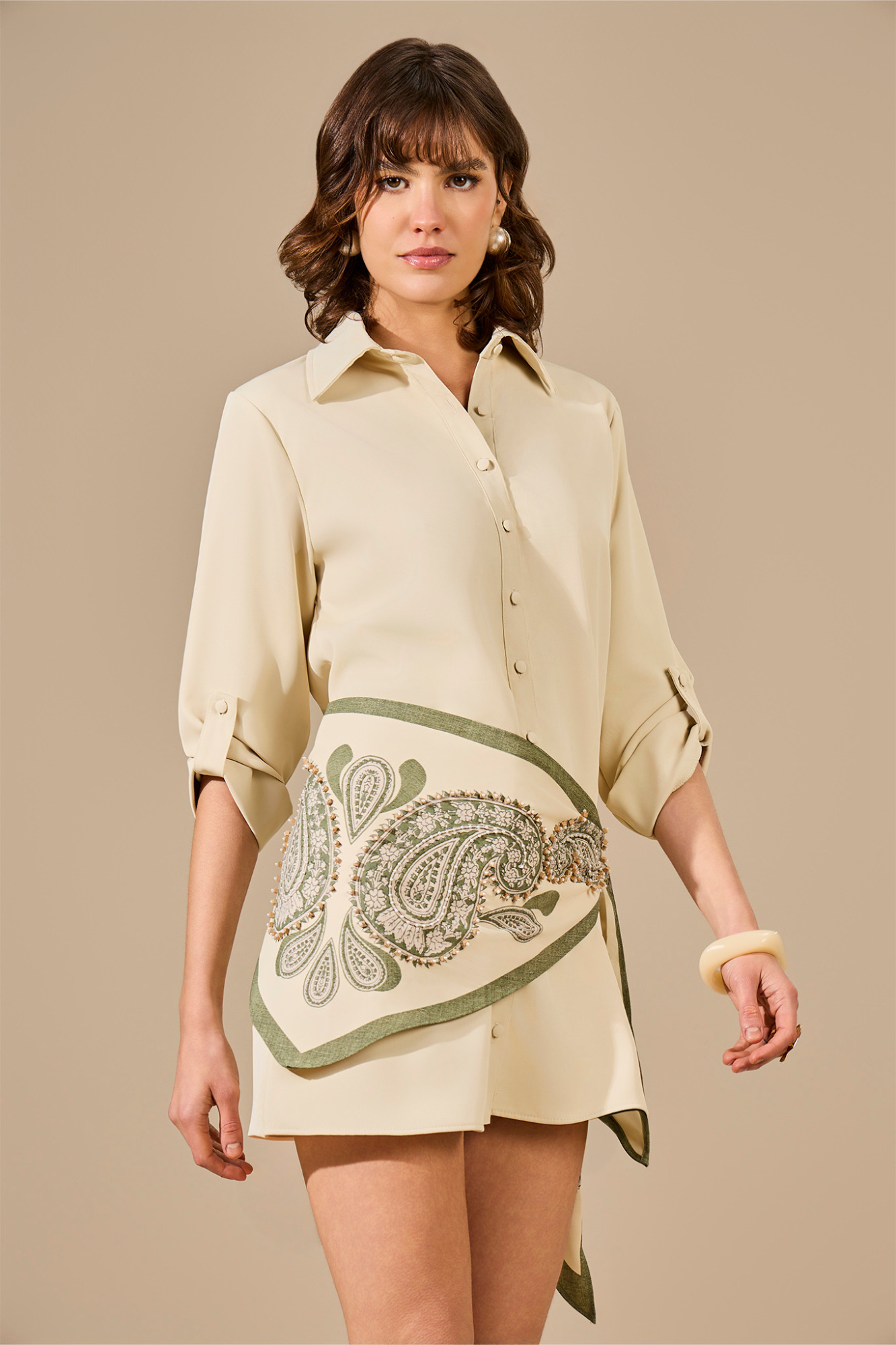 O destaque fica para o lenço com estampa localizada e bordado manual, pensado para ser usado na cintura ou como acessório versátil, transformando o look de acordo com a ocasião.