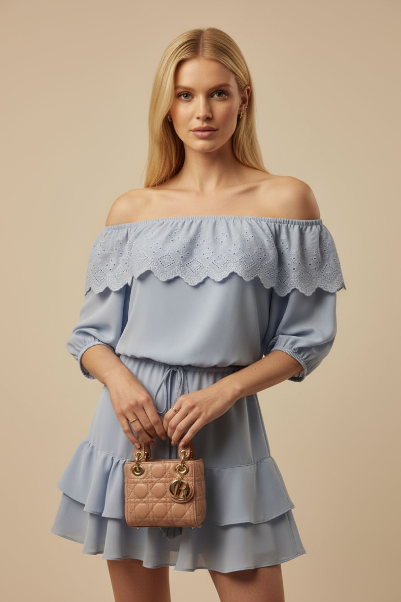 Confeccionado em chiffon, traz manga balonê e babado em renda no busto, que adicionam delicadeza e feminilidade à peça. Conta ainda com elástico na cintura com amarração e ponteiras, além de babados na saia, garantindo movimento e um caimento sofisticado.