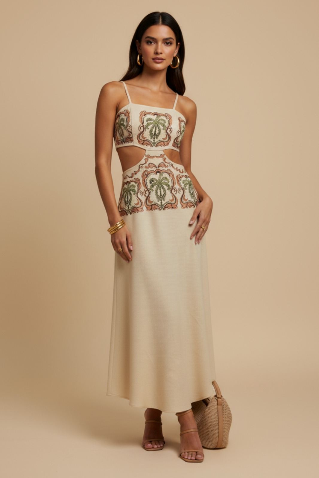 O design moderno apresenta recortes laterais (cut-outs) na cintura que valorizam a silhueta de forma sutil e charmosa, possui alças finas e caimento reto e fluido, combinando conforto e alta costura.