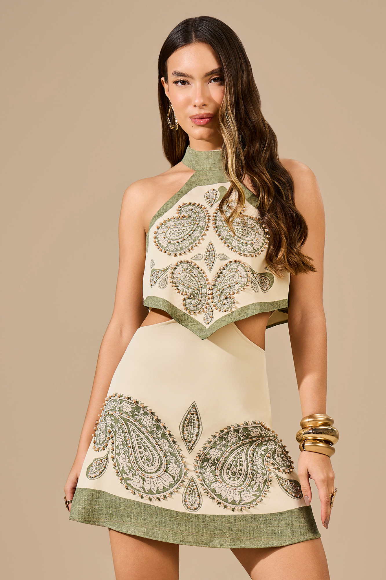 Este vestido curto é a definição de sofisticação moderna com um toque boho-chic. Perfeito para eventos diurnos ou noturnos que pedem um visual marcante e fresco.