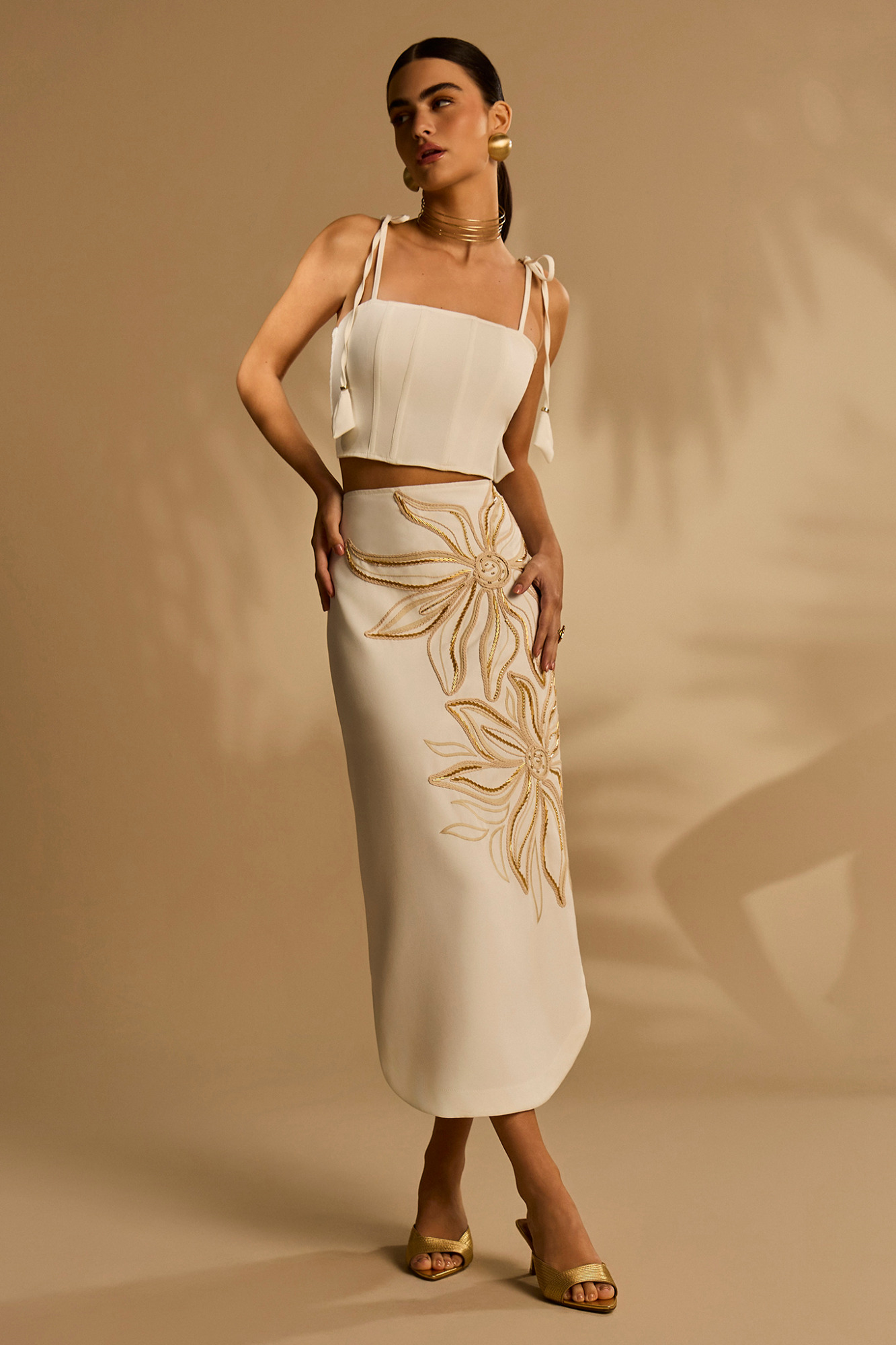 A saia midi, com bordado industrial frontal, traz um toque de originalidade e elegância. O fechamento posterior por zíper garante caimento perfeito e acabamento refinado.