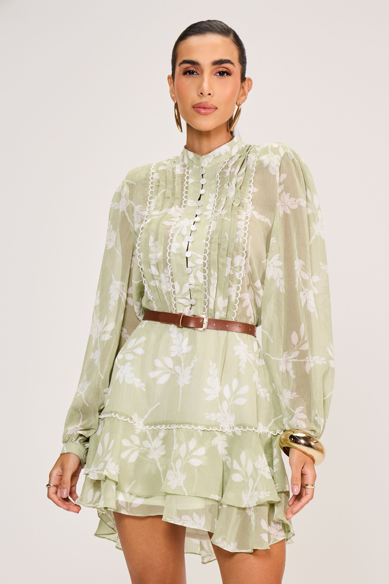 Vestido confeccionado em chiffon estampado, com caimento leve e fluido que valoriza o movimento da peça. Possui ombreiras que estruturam a silhueta, além de aviamento em passamanaria aplicada ao longo de todo o vestido, acrescentando riqueza visual e acabamento refinado.